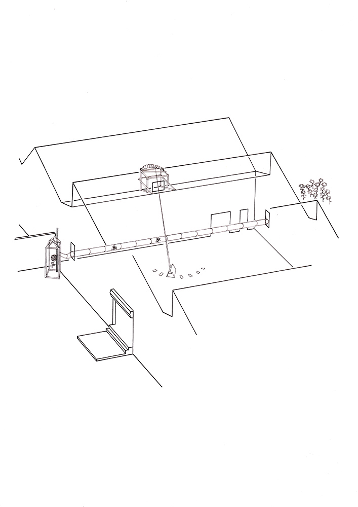 Sunlight guided by mirrors on the roof hits the prism (approx. every half hour) and makes a rainbow-colored spectrum on the floor. The transparent tube that goes through the inside of the building right near the prism makes a tunnel for bees from the side of their honeycomb to the other side of flower garden.