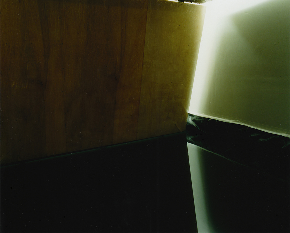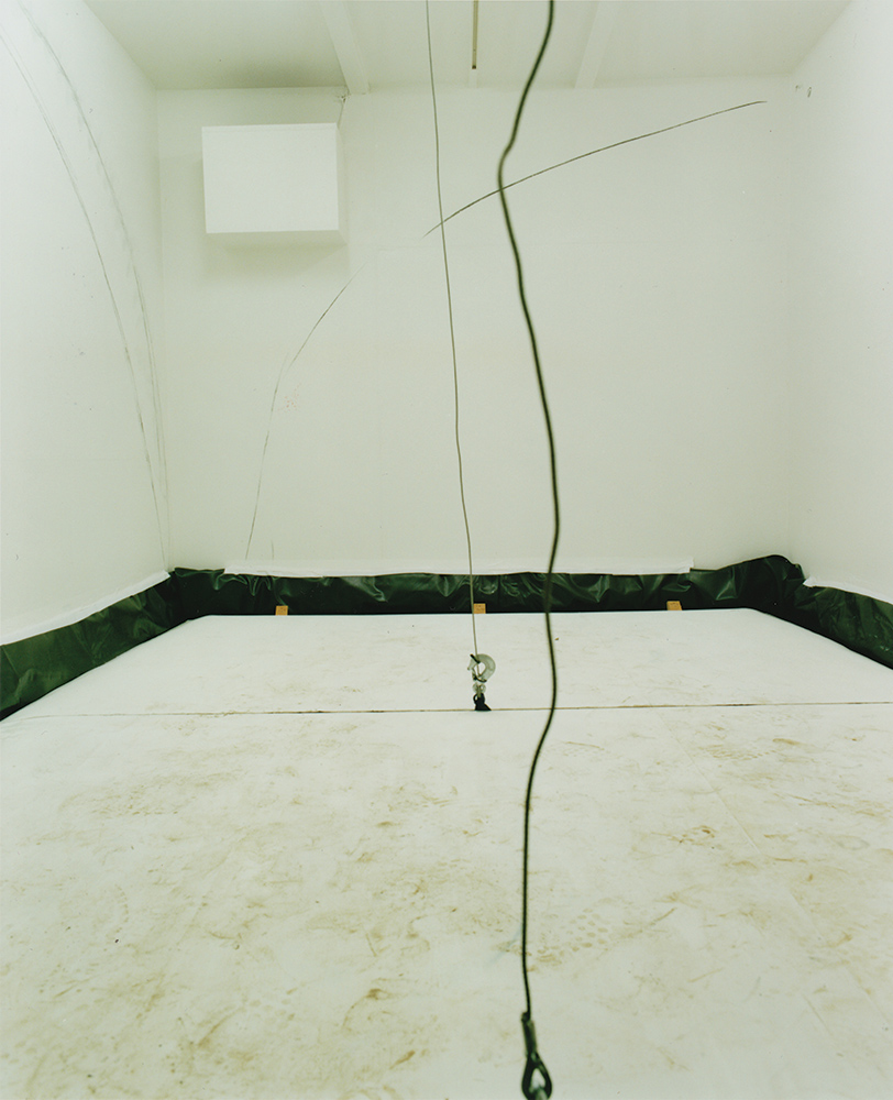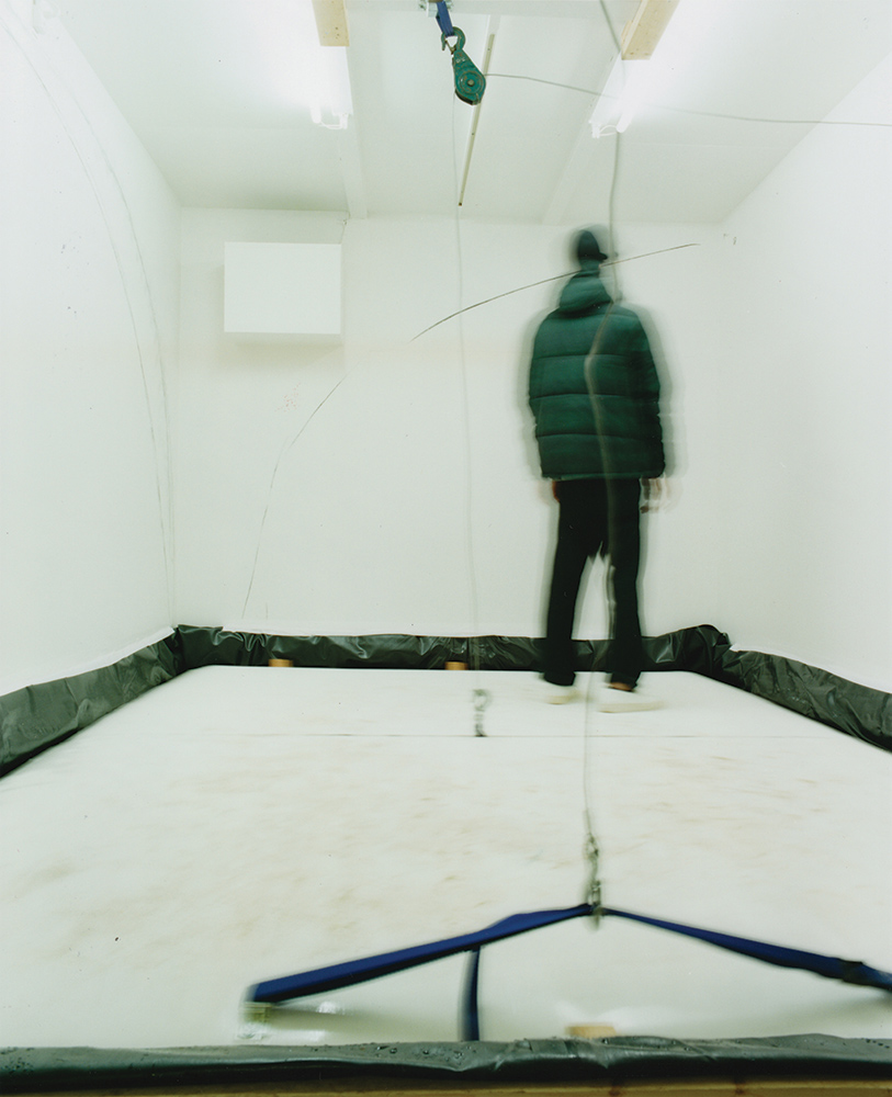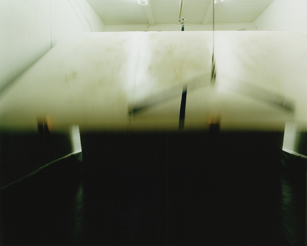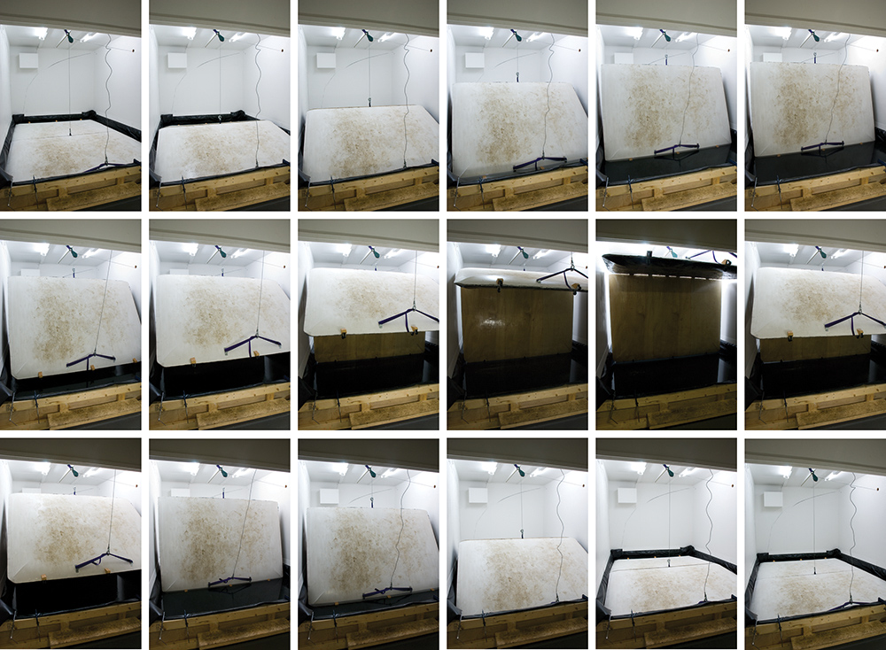 Viewers step on the wooden surface floating on water as they enter the exhibition space. They can stand on it and linger. When the float suddenly starts to move, viewers take steps away. Two winches pull up the float and turn it into an upturned L-shape. The L-shape and its reflection on the water form a rectangular room, which viewers can see.
