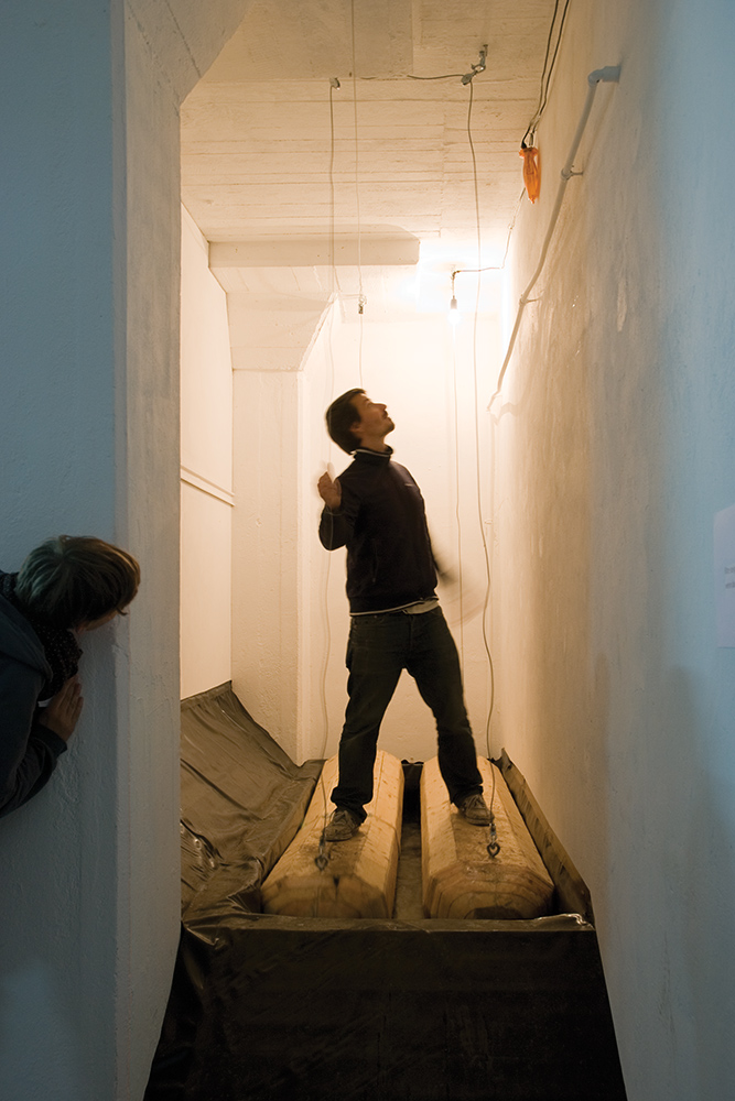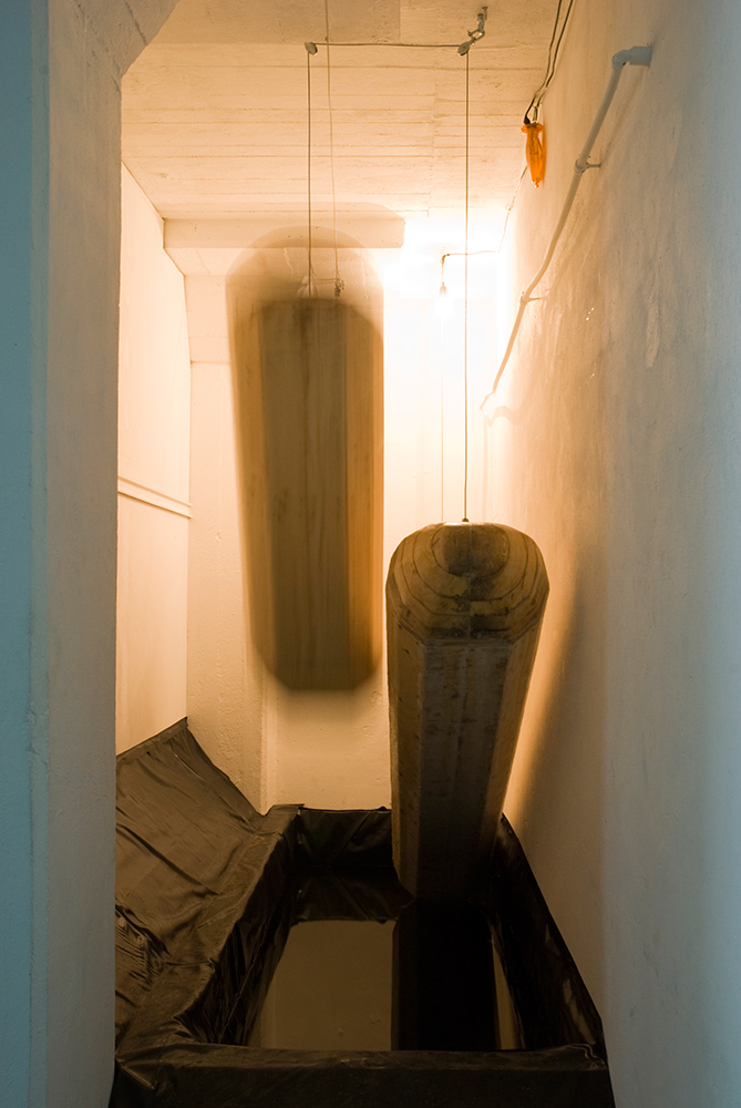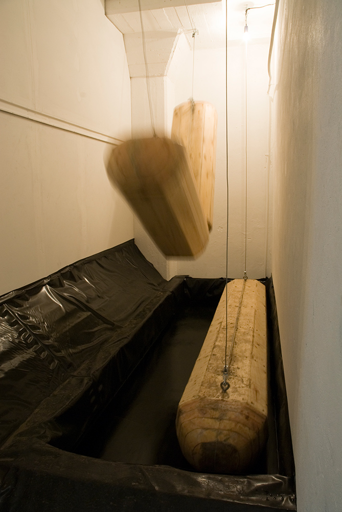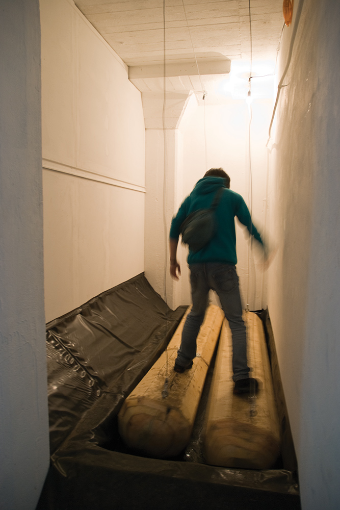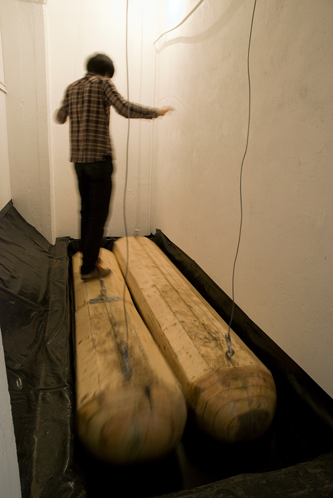 Viewers stand on two wooden floats, which were installed in a narrow corridor. When the warning lamp lights up, floats are suddenly pulled up from water by a winch.