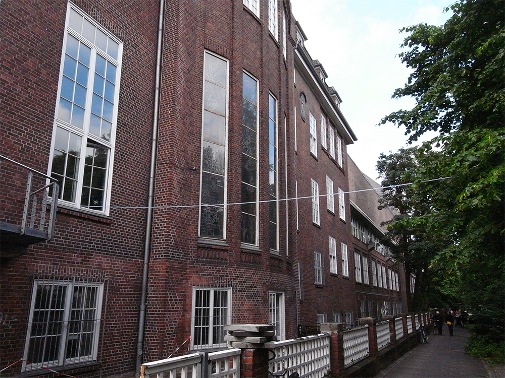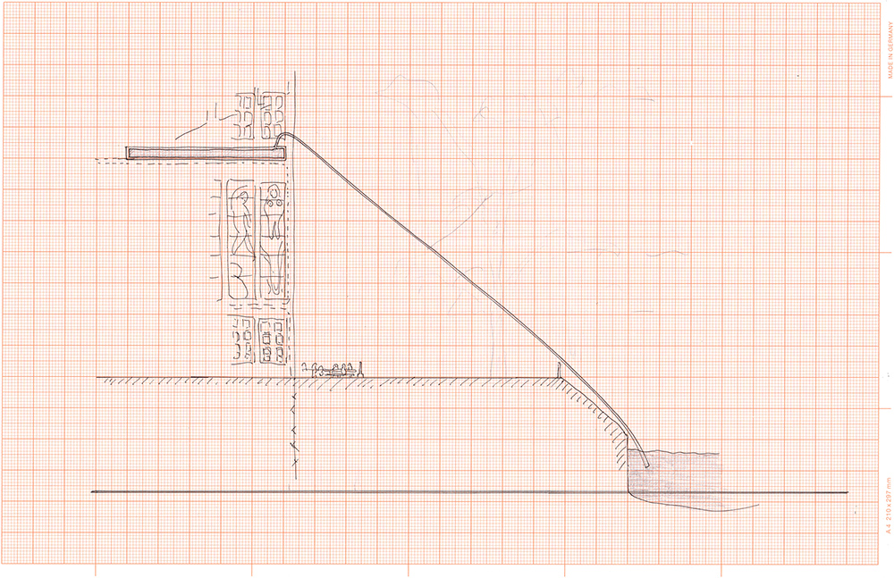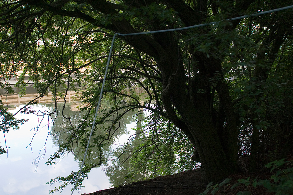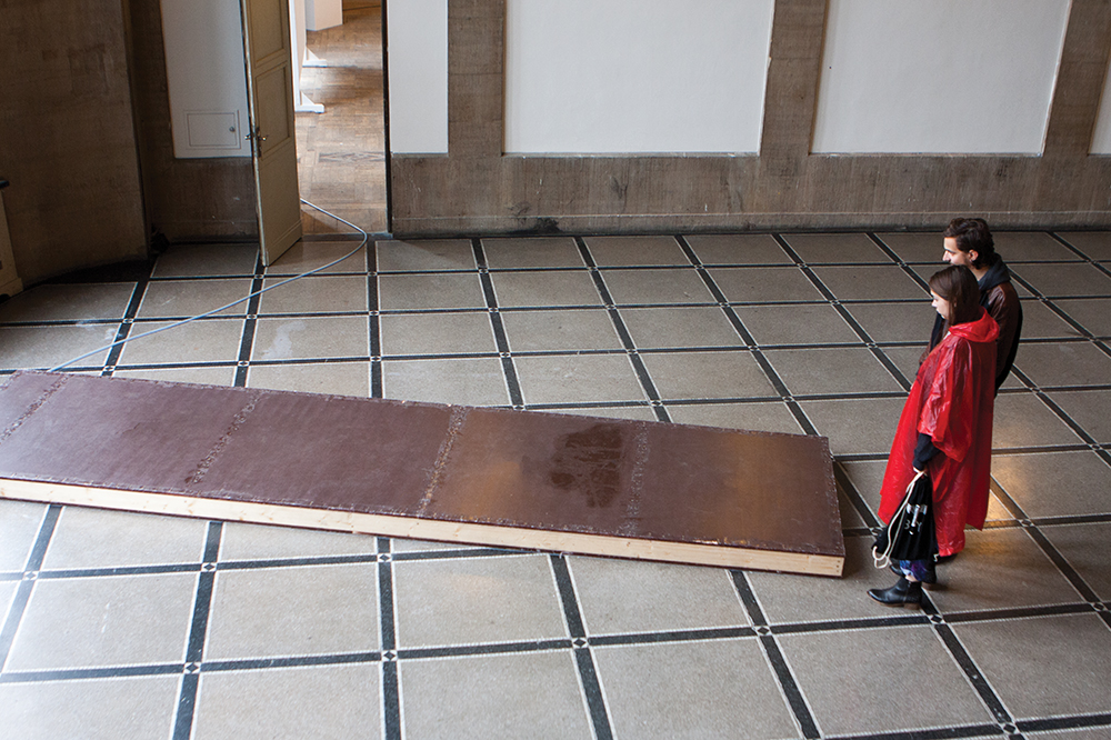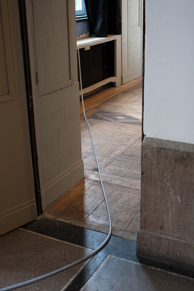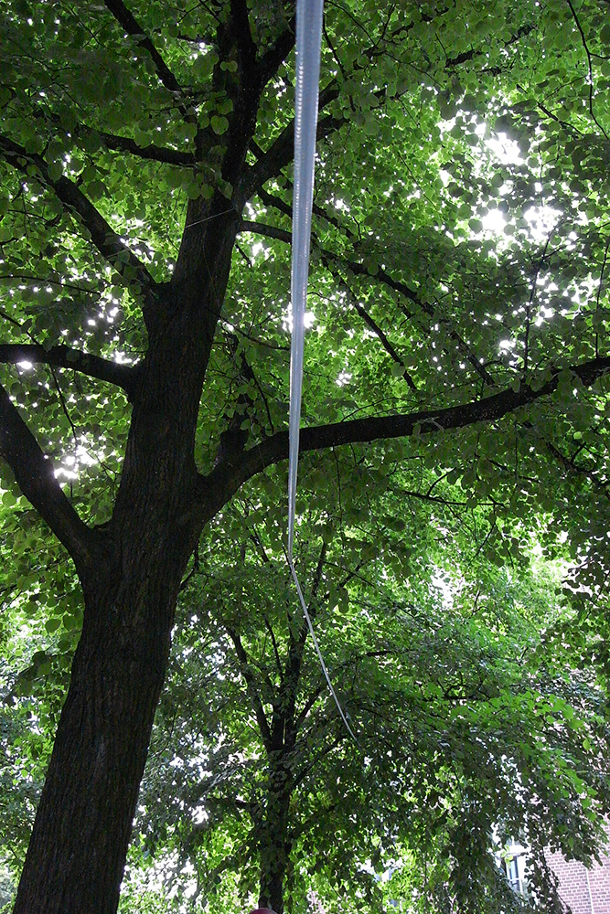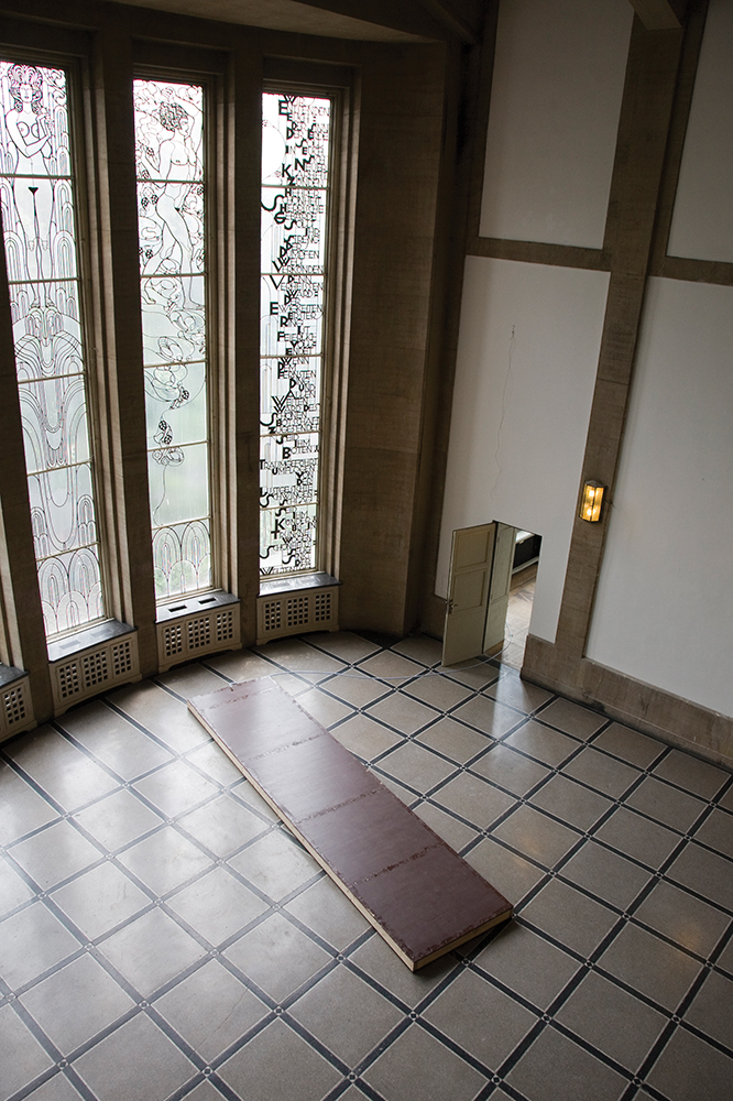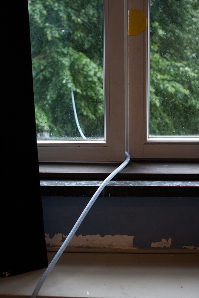 The box on the floor of the hall was made almost airtight with waterproof plywood, and filled with water from the canal running next to the building. A suction hose runs from the box to the canal which was also filled with water. Despite this height difference of approximately 9 meters between the hall floor and the water level of the canal, the water remains inside of the box because of air pressure which works on the surface of the canal.