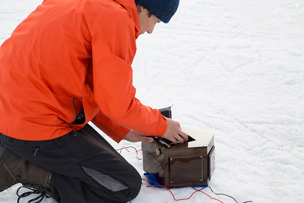 Five pictures were created on this expedition. Every picture of »Winter Landscape« is presented in a frame made from a wood that grows in the place where I skated. Each frame has a different profile which I designed. For the Antarctic Winter Landscapes, I used a milky-white plexiglass instead of wood because trees do not grow there.