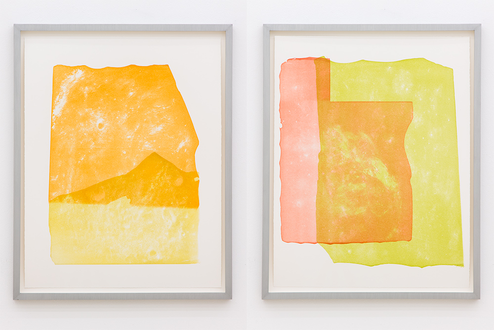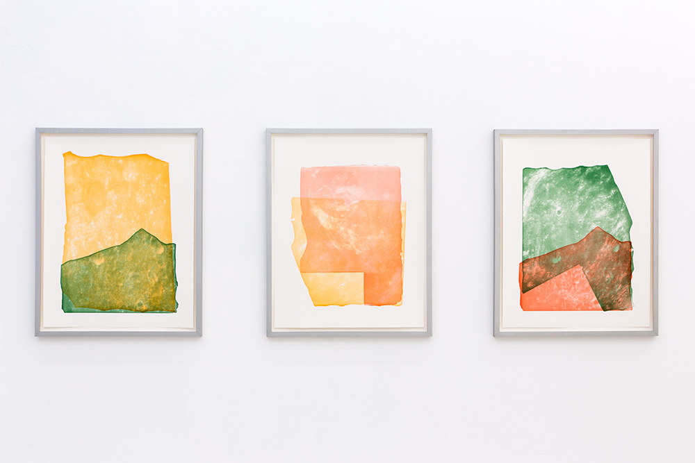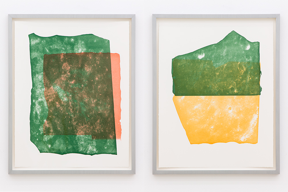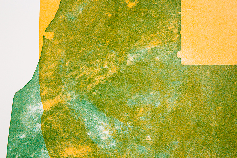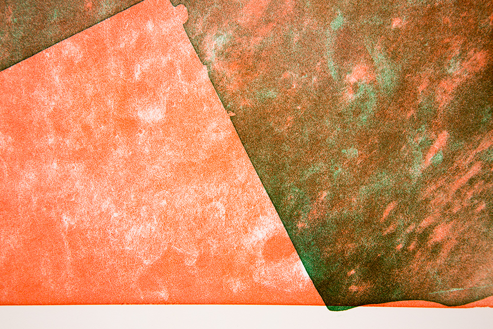 I applied EAC-1A to the black printing plate and rubbed it in until tiny scratches appeared on the plate. In this way I drew the motifs on the printing plate. In addition, the prints are printed in the five different colors: red, orange, yellow, light green, and green. These colors correspond to the mini-glass particles contained in the lunar regolith.
